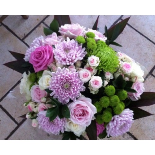 A delicate selection of colourful Roses and Chrysanthemum flowers in lilac's and pinks.
