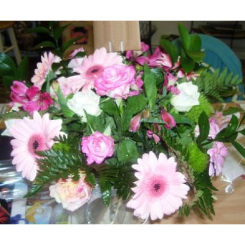 Containing Gerberas, Roses, Carnations, Alstromeria and foliage.