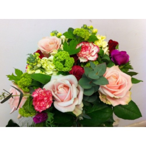 A compact fragrant bouquet with Roses, Carnations, Viburnum and fragrant Stocks.