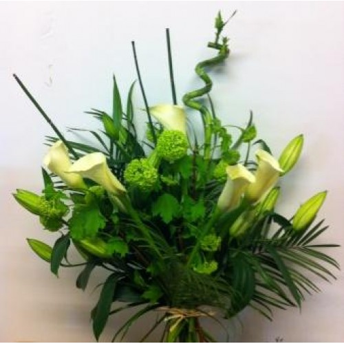 A delightful arrangement of Calla Lilies, Bamboo, Lilies, Viburnum and assorted foliage.