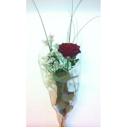 A single top quality red rose with white gypsophila and palm grass.
